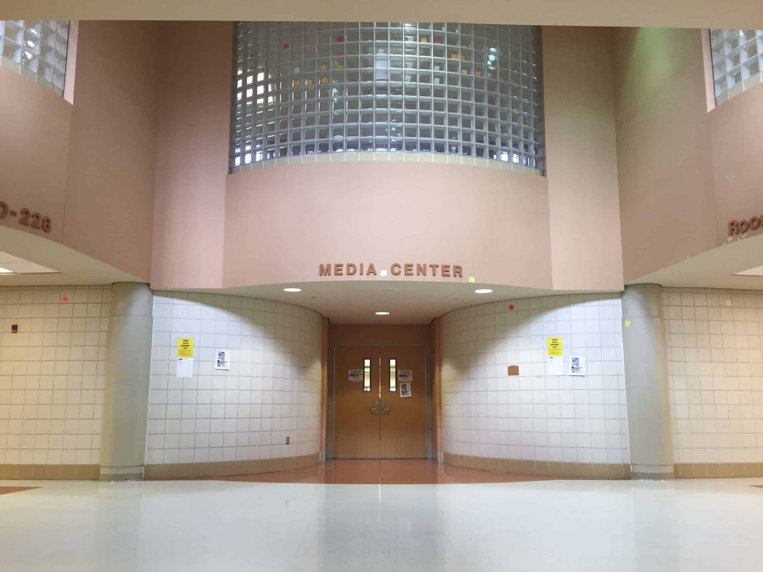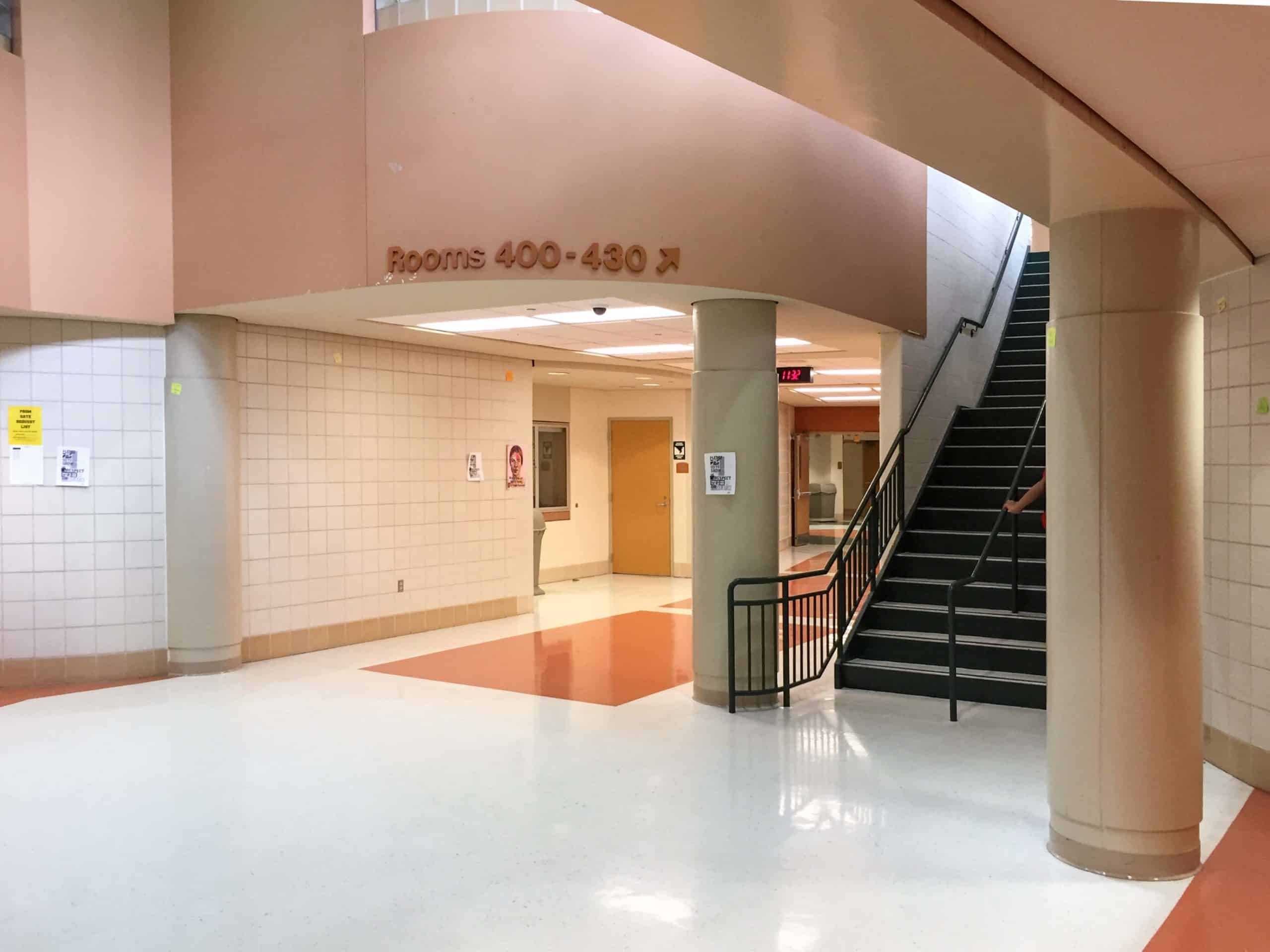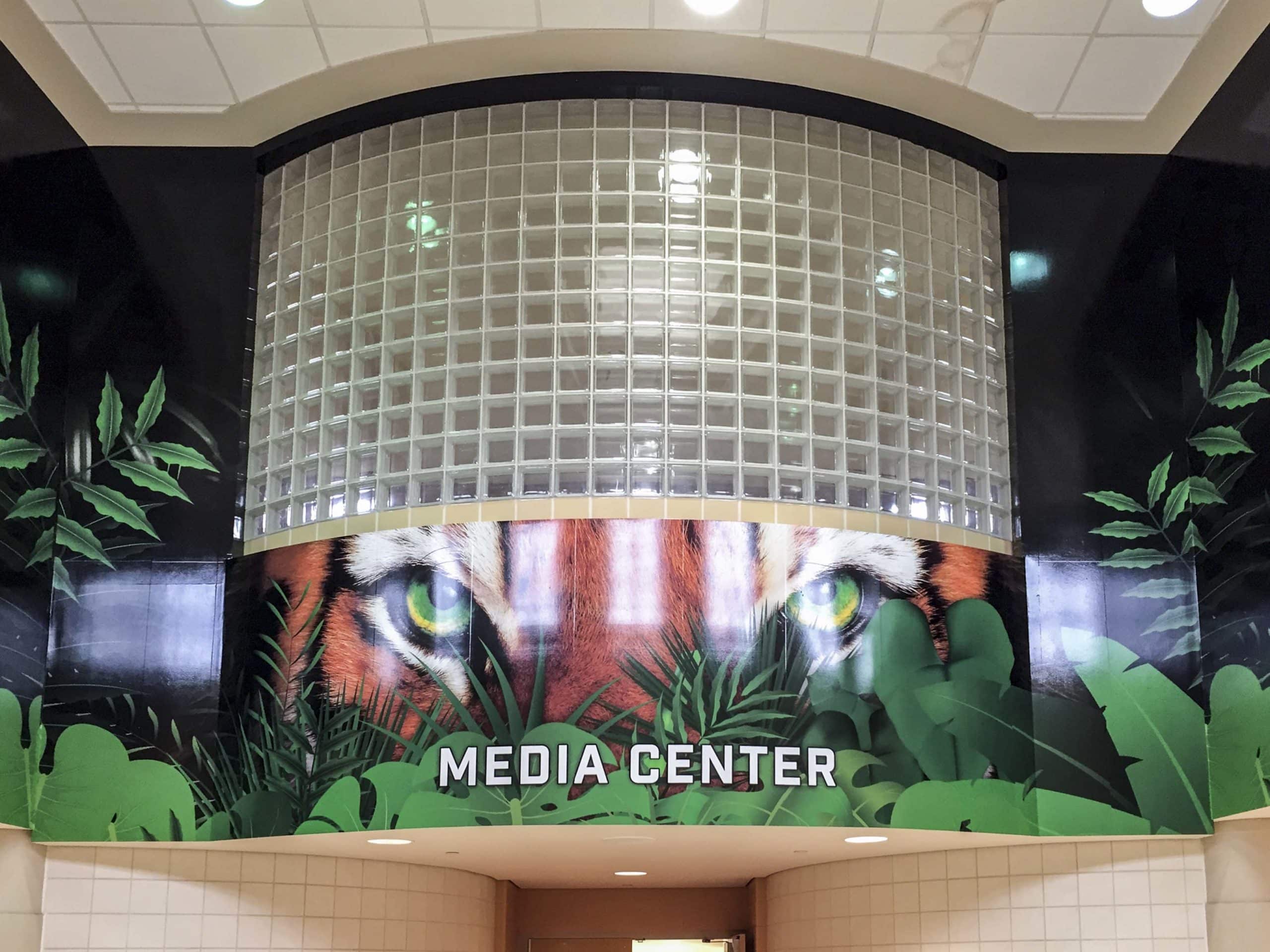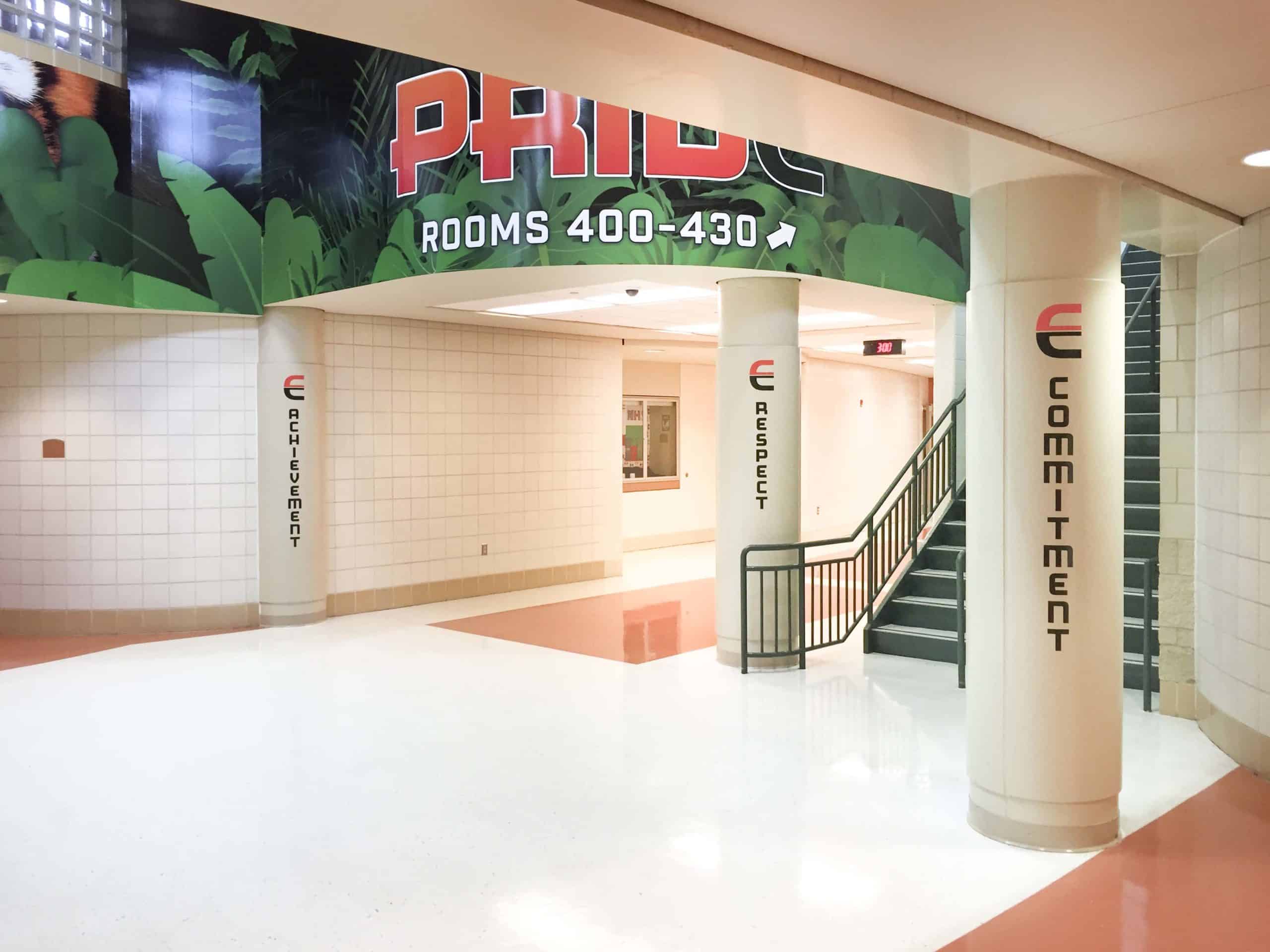 One of the first concepts we had the pleasure of installing at Plainfield East High School, was the undertaking of a challenging intersection in their main hallway. This 2nd story mural transformed a simple painted drywall into a work of art. With the graphic spanning the entire wall, measuring 78’ wide by 15’ tall, the design purposely incorporated directional signage above the staircases for their upper level rooms, replacing the 3D block letters. The left and right areas above the stairs required an articulated lift, reaching almost 30’. Check out the before and after images below.