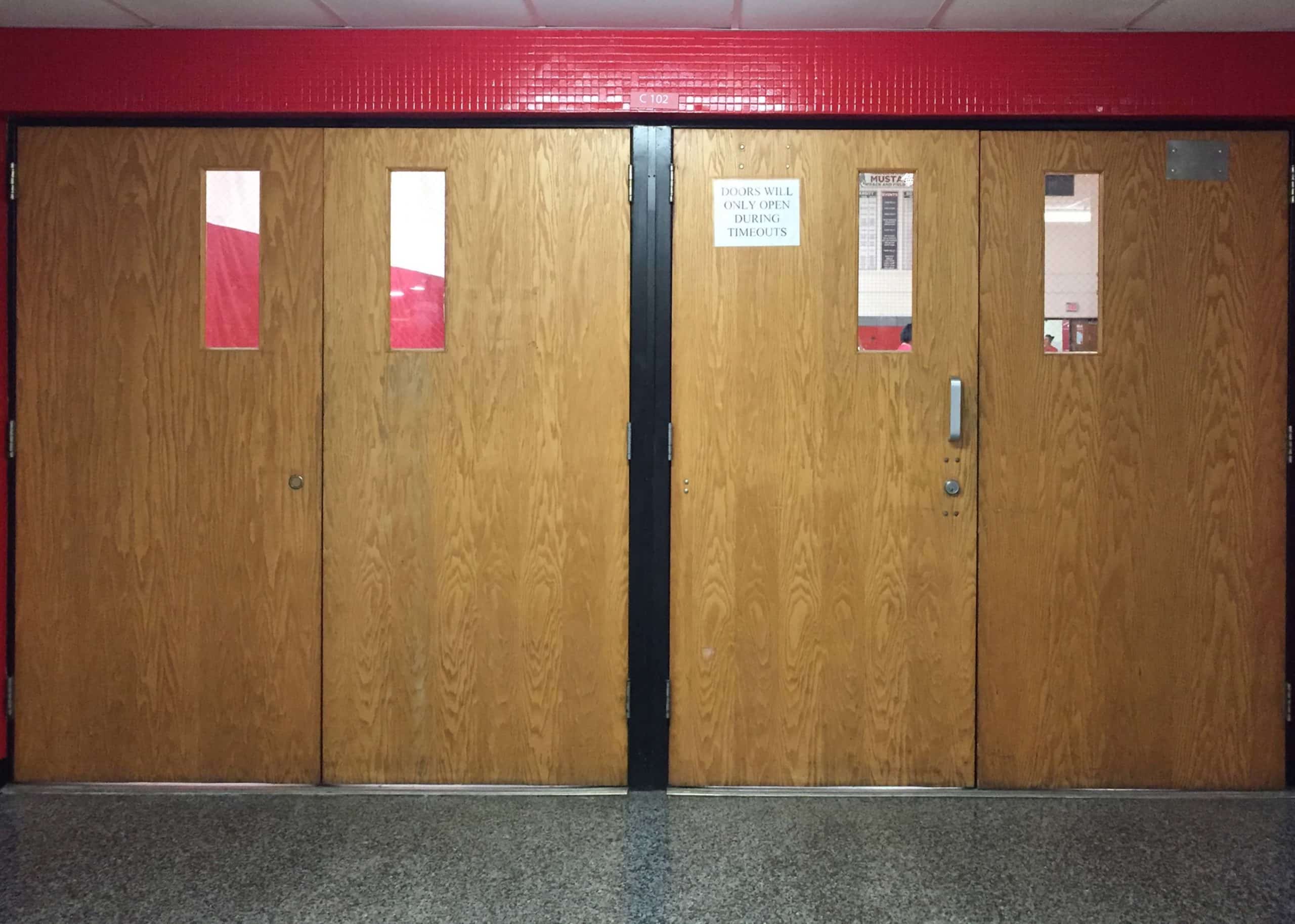 For this project, Mundelein High School welcomed us back to install graphics on their gym doors. We wrapped 2 sets of quad doors, the overall size of the graphic is 165” wide by 85.5” tall, plus a 5” center frame divider. Wrapping quad doors such as these are highly sought-after projects by our clients. Doors can often be quite drab and boring, not to mention old and beat up due to usage. Wrapping them with a fresh branded design gives them a whole new look, pride in the school and makes them way more cool! Check out the before and after images below.