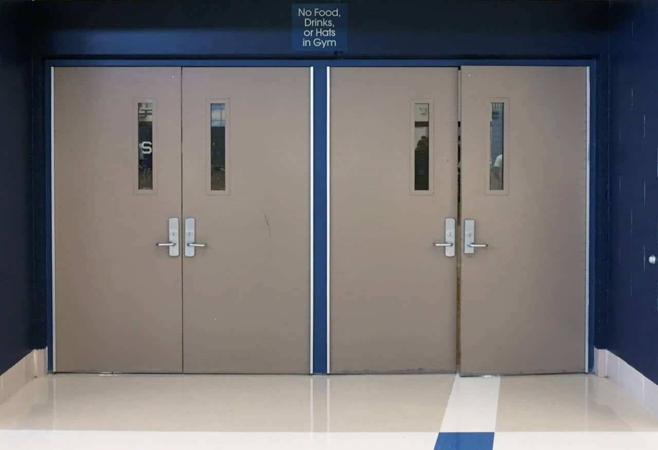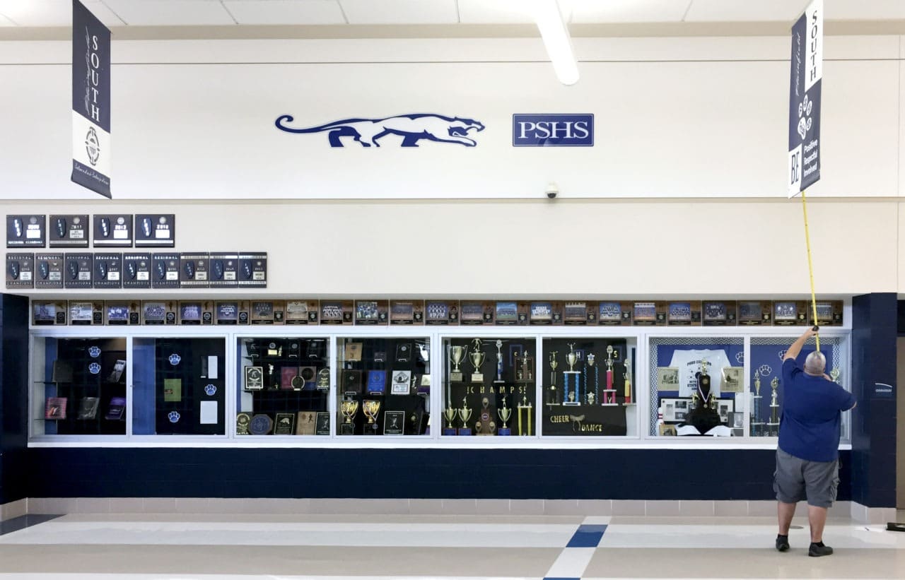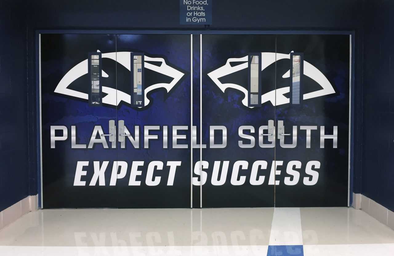 We were recently at Plainfield South High School, transforming the entrance to their main gymnasium. We installed matching graphics on two sets of quad doors, along with a 35’ x 5’ mural, high above, between the doors. Have a look at the before and after images.