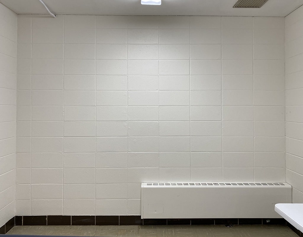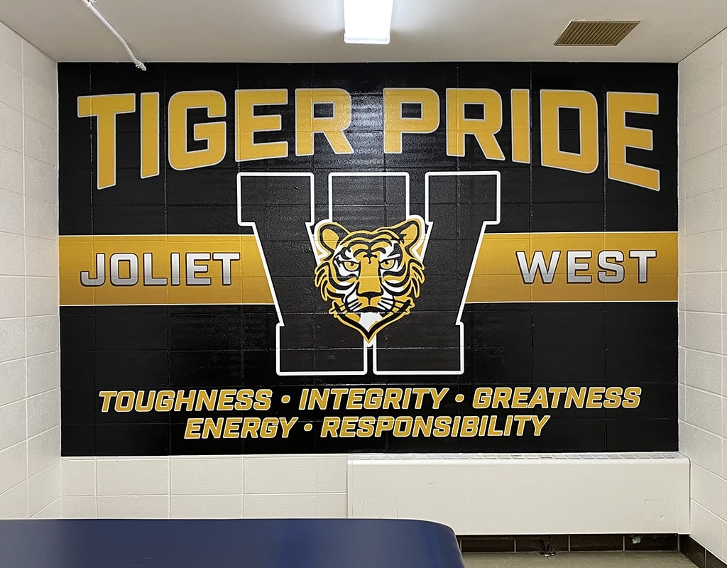 It was great to be invited back to Joliet West High School, in which we branded one of the end walls in the newly renovated training room. Once used for storage, it will now be used as a full training area, now with a 136″ x 86″ custom designed vinyl wall wrap. We just wish that darn conduit pipe could be above the ceiling, not below and through the wall. Oh well.