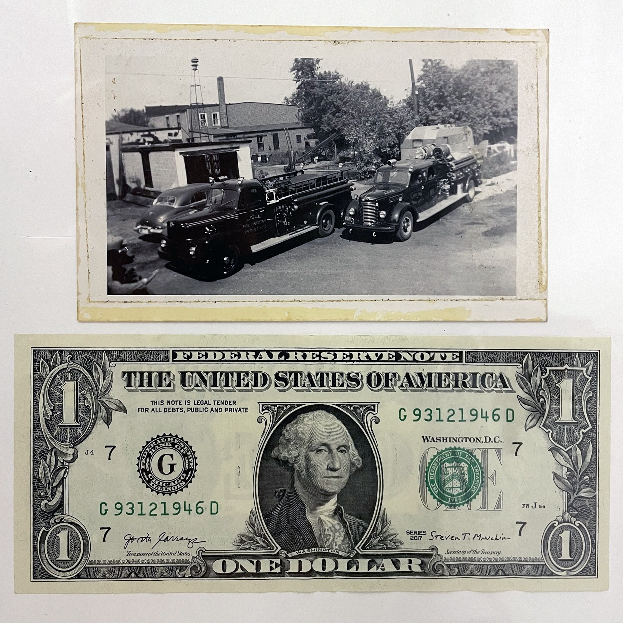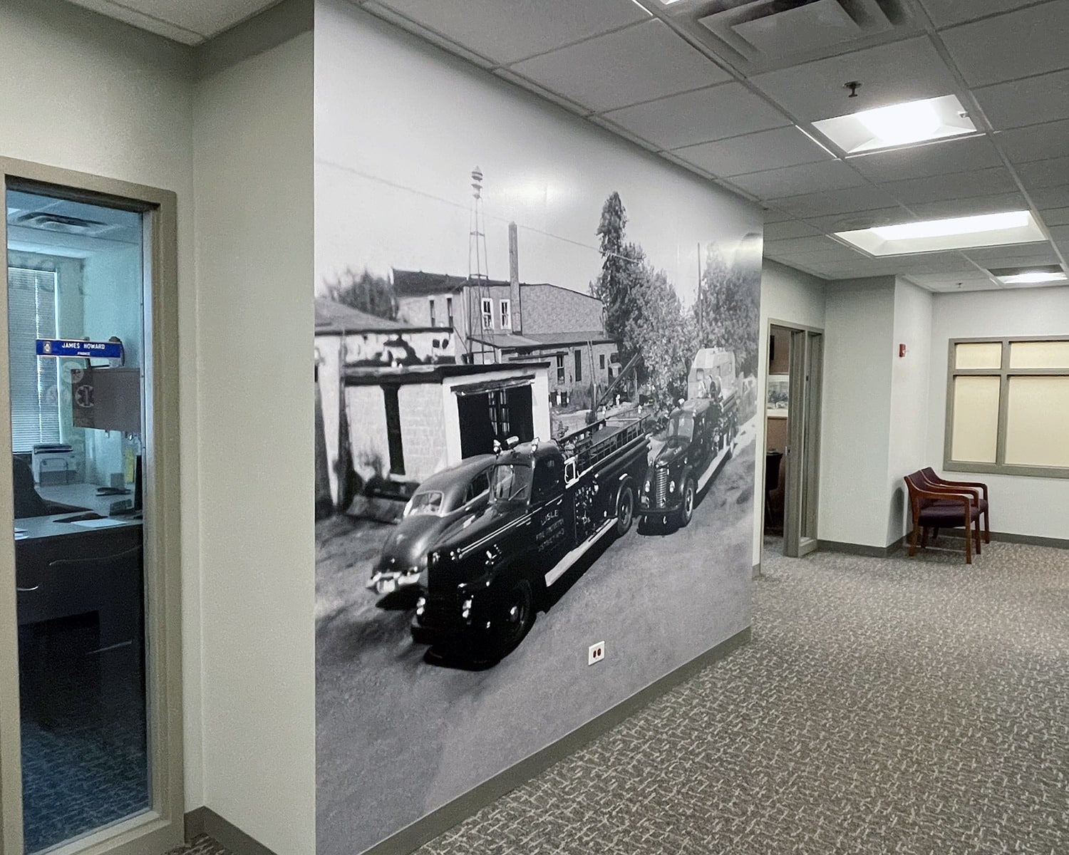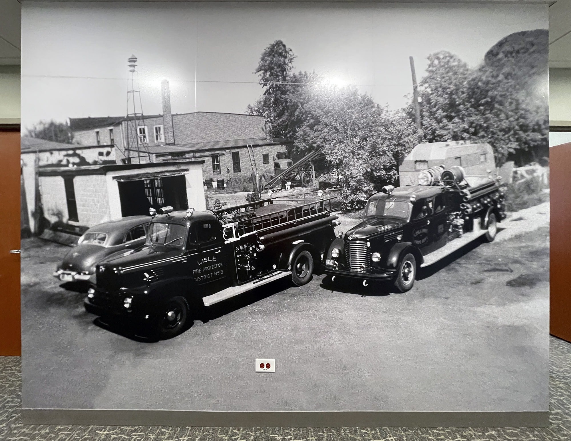 This project, commissioned by the Lisle-Woodridge Fire District, we created a 134″x104″ wall mural from a 4″x2″ 1940 something, “well-loved” print. Scanning at 2400dpi almost matched the 100dpi needed, perfectly, for a mural of this size. Then a few hours clean up, then formatting it to the wall size by adding sky and ground. The final installation was made with three 45″ panels with a lustre-laminated vinyl. Notice the dollar bill in the bottom left-hand corner of the top right image…sure looks tiny…