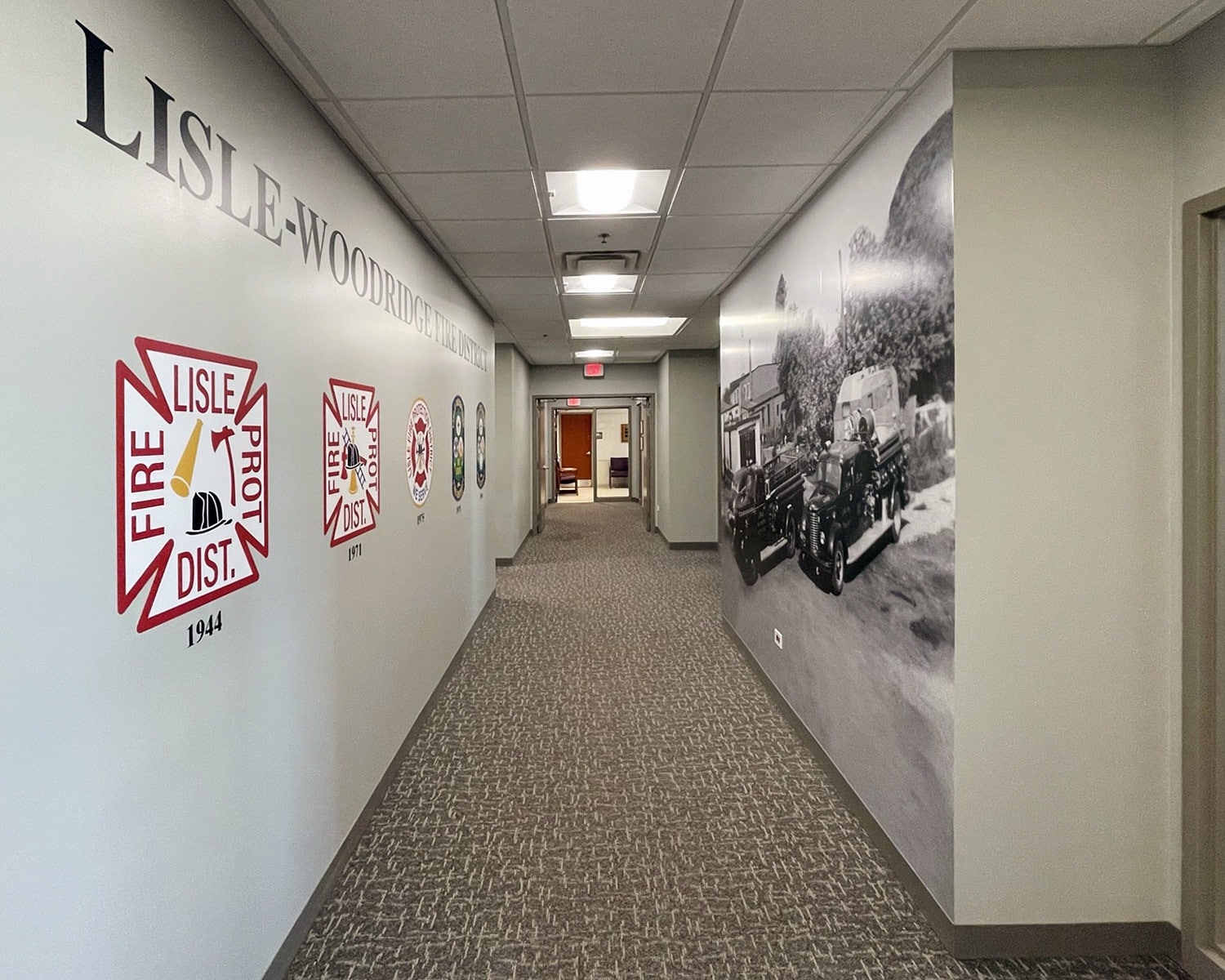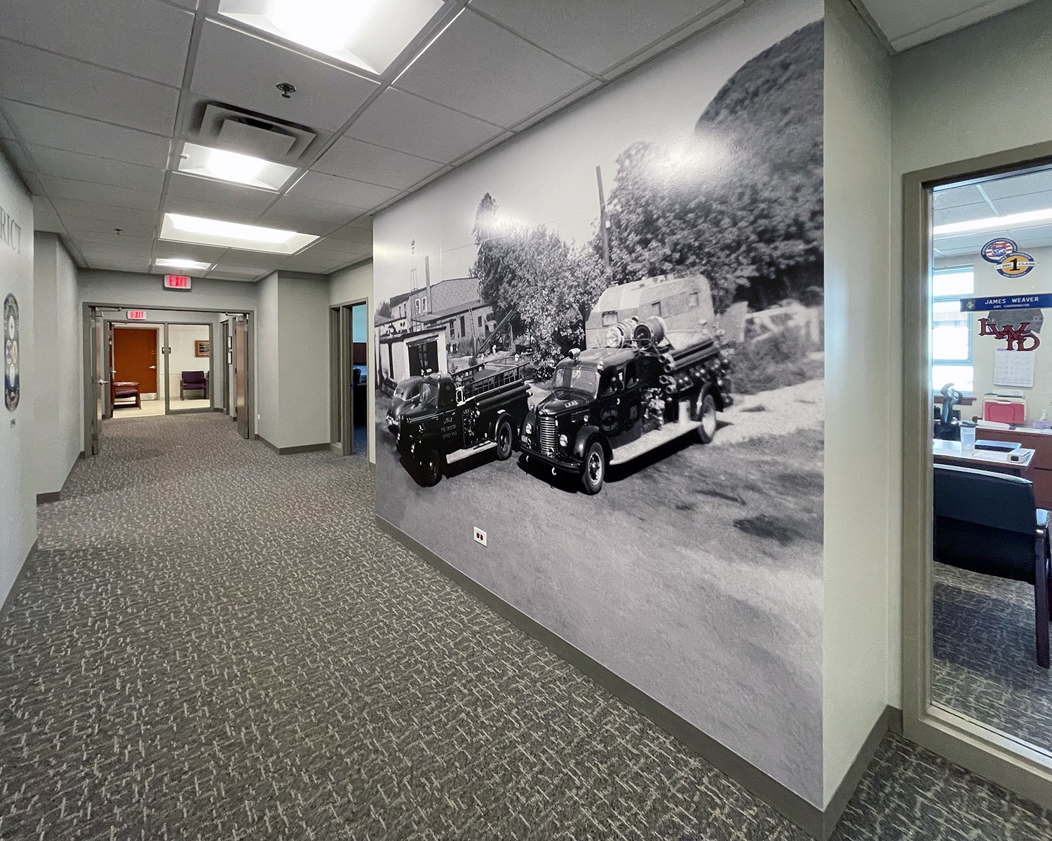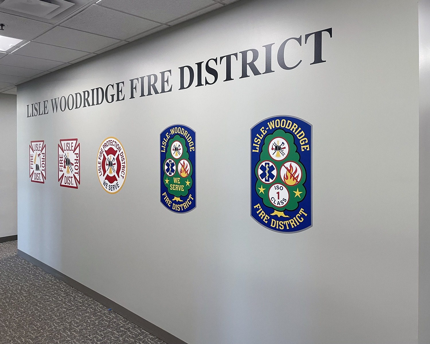 And, on the opposing wall, there are five custom recreations of the LWFD history of patches. These were installed a couple weeks prior. And now, with both sides completed, really adds a nice upgrade to gray painted walls. Thanks James and the rest of the LWFD for this opportunity.